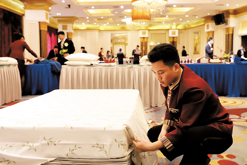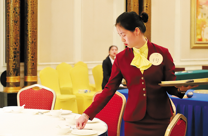 中式鋪床、中式宴會擺臺、前廳接待等項目選手在比賽中