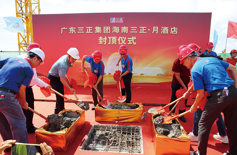 封頂儀式由莫浩棠董事長、莫浩松副董事長、歐陽靜達董事長、傅仕新先生、戴俊明助理總裁、韓寶君董事長、尹建華總經理、包義成CEO等8位嘉賓共同主禮,隨著他們一起揮動金鏟,將最后一方混凝土澆筑完畢,標志著三正·月酒店主體結構順利封頂!