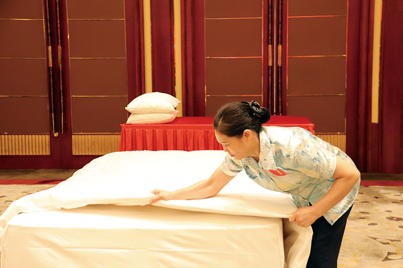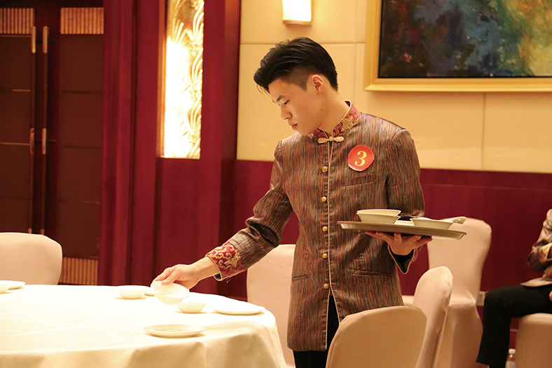 本次比賽項目涵蓋前臺接待服務、溫泉服務、西式宴會6人位擺臺、中式鋪床和中式宴會8人位擺臺及接待等。在決賽現(xiàn)場可以看到,前廳接待選手們儀態(tài)大方,微笑面對“客人”,從入住接待、退房結賬到服務英語,舉手投足都展示出作為酒店前臺工作人員的專業(yè)素養(yǎng);溫泉部的選手們分別從打水、疊毛巾到配對拖鞋這三項基礎技能展開競技,比賽過程中選手們很好地展示了他們的專注和熱忱;在西餐宴會擺臺中,鋪餐布、放裝飾、碗、盤、碟、筷、酒杯、湯匙……依次擺開,選手們全神貫注,每一個步驟都有條不紊。規(guī)范的流程無不顯露出對工作的細心和對服務的完美追求;中式擺臺,每一件餐具、用具都擺放得恰到好處,展現(xiàn)出一種整齊有序的美感。這種擺臺設計不僅彰顯了中式風格的獨特魅力,更給人一種高貴、優(yōu)雅的體驗;在中式鋪床比賽項目中,選手們開單、拋單、包角、定位等動作忙而不亂,鋪床單、理被套、裝枕芯、套枕頭一氣呵成,將力量與技巧融合之美展現(xiàn)得淋漓盡致。