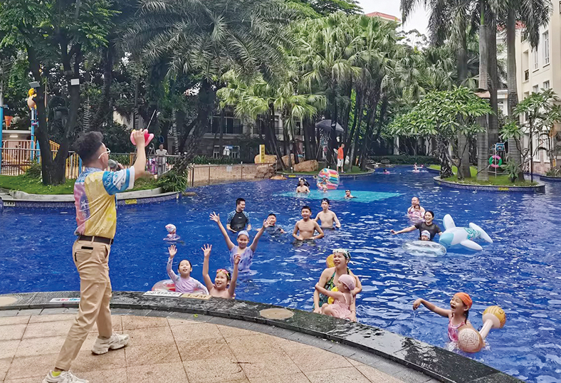 節日當天,酒店的室外園林泳池成為了小朋友們的樂園,工作人員準備了充氣鯨魚坐騎、鯊魚坐騎和彩色大泳圈等水上游樂玩具,吸引了眾多小朋友到場游玩,現場洋溢著歡聲笑語。下午兩點半左右,風云突變,突降大雨,不過這并未影響賓客的興致,酒店工作人員迅速將所有在戶外泳池的客人安全轉移至室內大堂,并把大堂迅速轉變為一個充滿樂趣的室內活動場所,小朋友們在家長的陪伴下,盡情享受了別樣的派對樂趣。