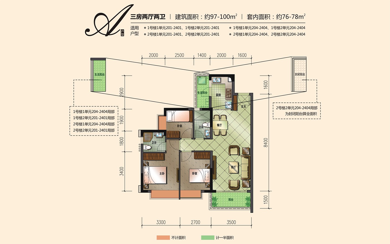 三房兩廳兩衛 建筑面積:約97-100m2 套內面積:約76-78m2。