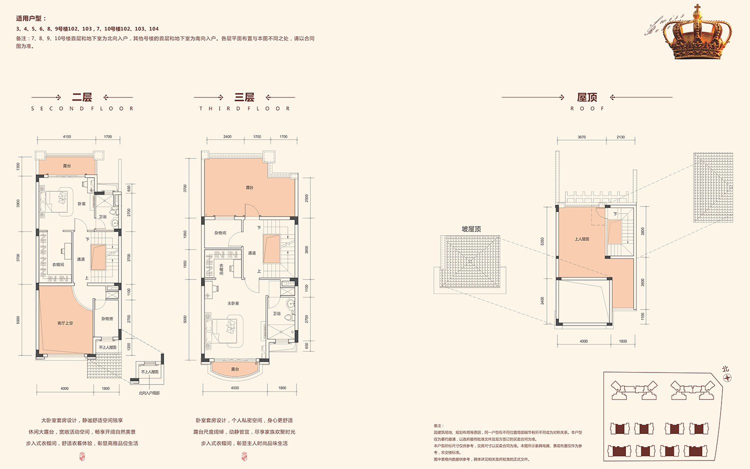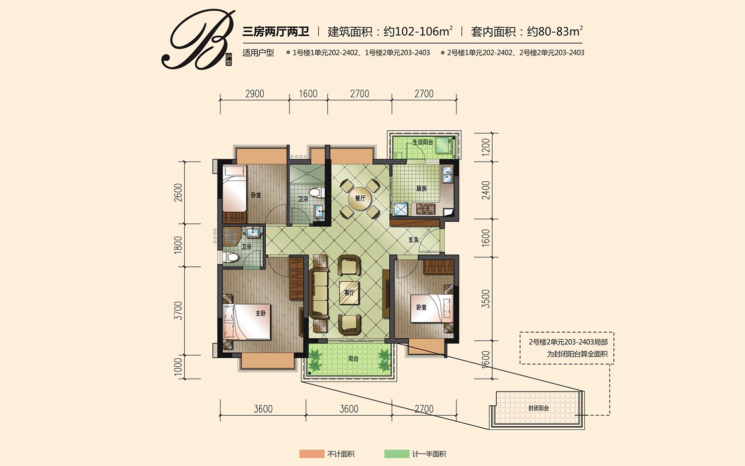 三房兩廳兩衛 建筑面積:約102-106m2 套內面積:約80-83m2。