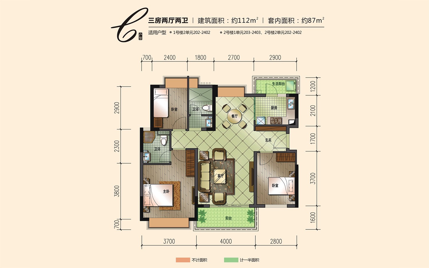 三房兩廳兩衛 建筑面積:約112m2 套內面積:約87m2。