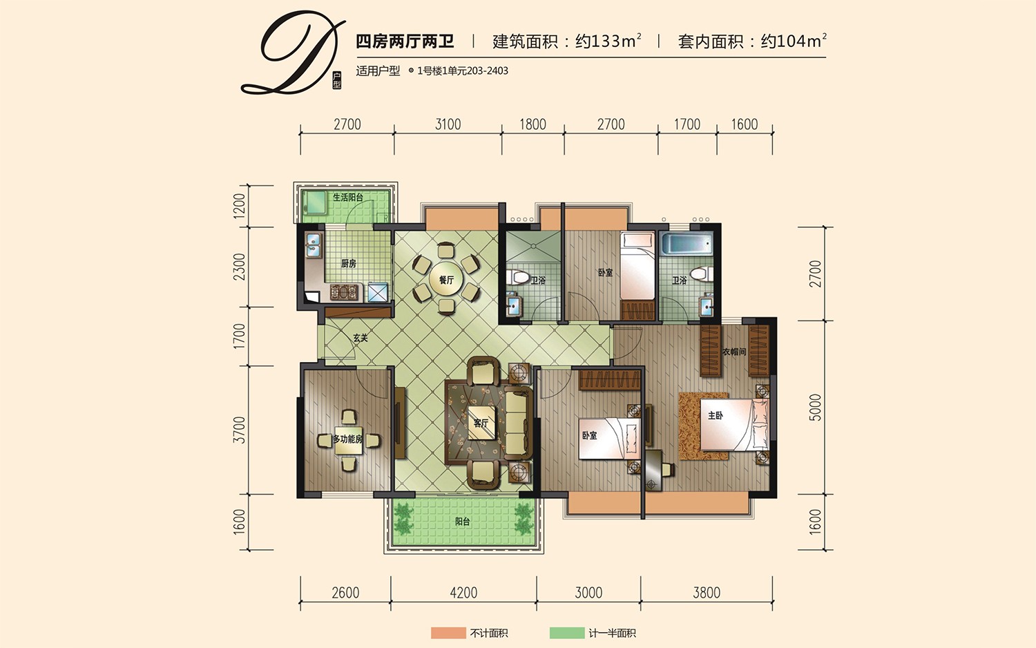 四房兩廳兩衛 建筑面積:約133m2 套內面積:約104m2。